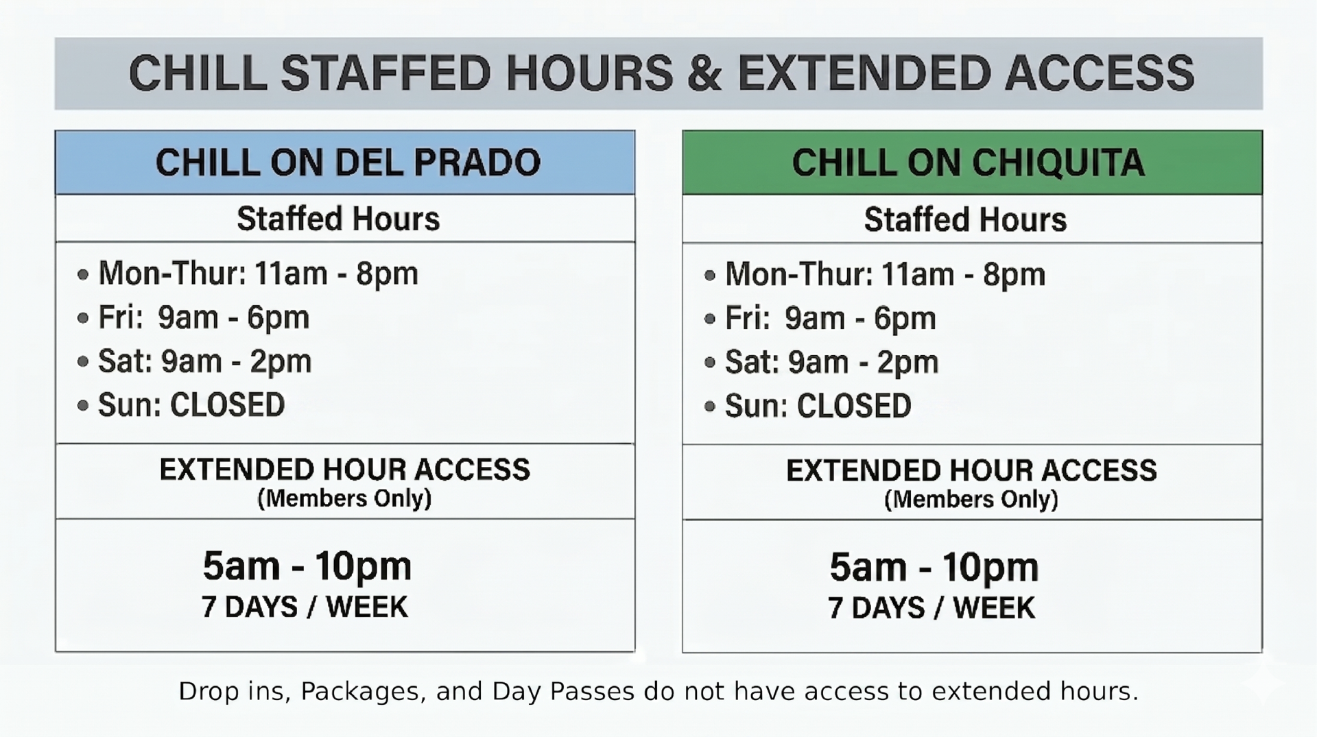 Extended Hour Access for Members Only 5am-10pm 7 days per week Regular hours 11am-8pm Mon-Thur 9am-6pm Fri 9am-2pm Sat CLOSED Sundays